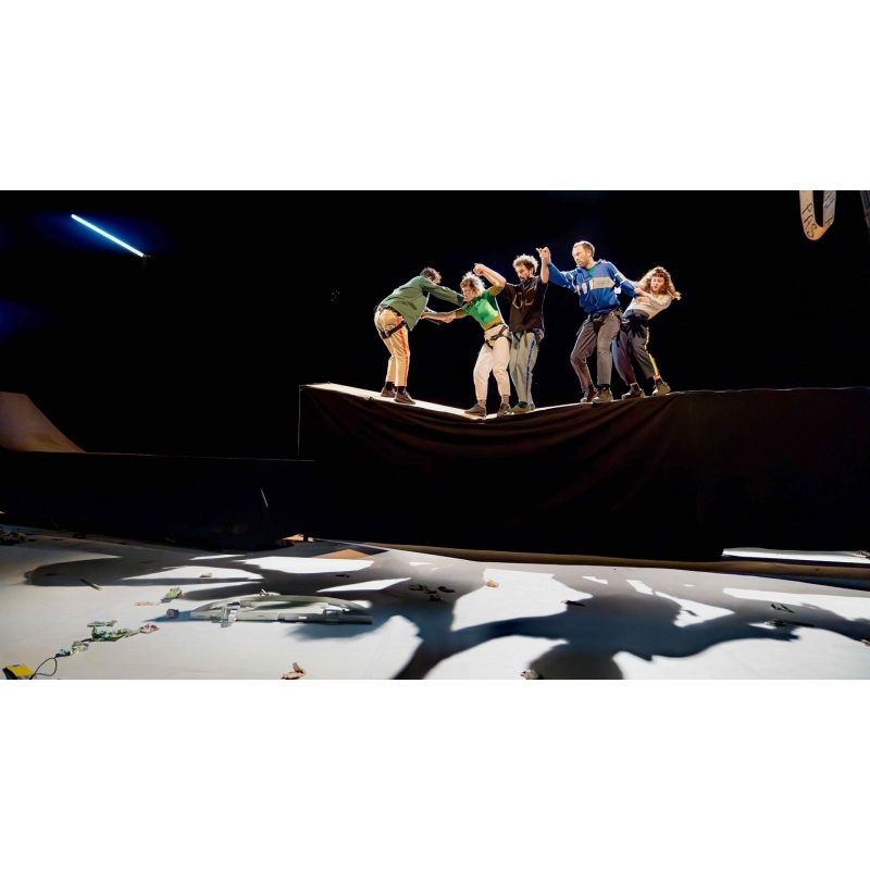 Mais c’est compter sans leur ingéniosité, leur faculté de résilience et leur indéniable courage. Frasques est une pièce acrobatique joyeusement déstructurée, impulsive, détonante, qui se joue du temps comme de l’espace. Aux prises avec une machinerie inventive au rythme débridé, les cinq acrobates aimeraient s’extraire de tables mouvantes, sols incertains, mondes à l’envers.